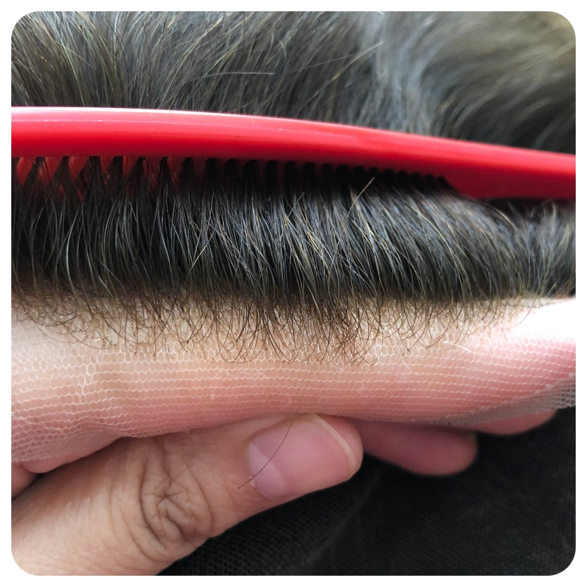 Gradually decreasing hair volume in the front, single hair is single knotted in slightly wave shape along hairline instead of stiff straight hairline.